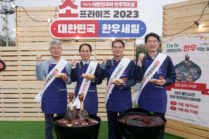 1일 오전 서울 서초구 하나로마트 양재점 주차장에서 전국한우협회가 농협경제지주, 한우자조금관리위원회와 함께 진행한 ‘2023년 대한민국이 한우먹는날’ 행사에서 (왼쪽부터) 김영원 전국한우협회 전무, 박선빈 한우자조금관리위원회 사무국장, 박철진 농협축산경제 축산지원본부 상무, 김태완 농협유통 하나로마트 양재점 지사장이 한우 풀드비프를 나눠주기 전 기념촬영을 하고 있다.
