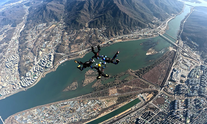 육군특수전사령부 요원들이 고공강하 훈련 도중 공중에서 서로 손을 붙들고 ‘상호활동’의 대형을 만들고 있다. 15일 특전사에 따르면 지난 4일 시작한 ‘특수전사령관배 고공강하 경연대회’가 오는 17일까지 경기 하남시 특전사 고공훈련장에서 진행된다.