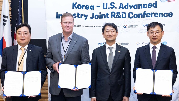16일(현지시간) 미국 샌프란시스코에서 열린 ‘한·미 첨단산업 국제 공동 R&D컨퍼런스’에서 전윤종 KEIT 원장(우측부터), 안덕근 산업통상자원부 통상교섭본부장, 데릭 존슨 솔리드파워 최고운영책임자, 신희동 KETI 원장이 차세대 배터리 분야 글로벌 연구개발 협력강화를 위한 다자간 업무협약을 체결하고 기념촬영하고 있다. 한국산업기술기획평가원(KEIT) 제공