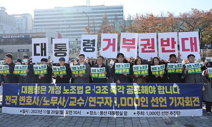 '개정 노조법 2·3조의 즉각 공포를 촉구하는 전국 교수·변호사·노무사·연구자 1천인 선언 추진단'은 이날 오전 서울 용산 대통령실 앞에서 기자회견을 열고 "윤석열 대통령은 양곡관리법, 간호법 등에도 거부권(재의요구권)을 남용했다"며 "만약 노란봉투법에도 거부권을 행사한다면 사회적 갈등은 증폭될 것"이라고 주장했다.