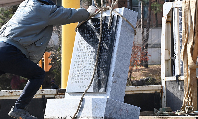 28일 경기 성남시 분당구 백현동의 한 유치원 인근에서 철거업체 관계자들이 이완용 생가터 푯돌을 철거하고 있다. 성남문화원은 지난 22일 사업비 250만원을 들여 이완용 생가터 푯돌(가로 75㎝, 세로 112.5㎝)을 설치했다. 문화원은 후대에 역사적 교훈을 전하기 위해 이완용의 친일 행적을 알리는 425자의 문구를 비석에 새겨 넣었다. 하지만 인근 주민들이 반발하자 문화원 측은 이날 긴급 철거했다.