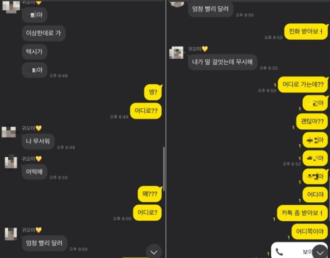 극도의 불안감을 느낀 C씨는 남자친구에게 “이상한 데로 택시가 가. 나 무서워. 엄청 빨리 달려. 말 걸었는데 무시해” 등의 문자를 보냈다. 여러 차례 멈춰달라는 요구에도 A씨가 미동도 없이 빠르게 주행하자 C씨는 남자친구에게 전화를 걸었다. 남자친구는 전화를 통해 “아저씨 세워주세요. 아저씨 세워주세요!”라고 요청하는 C씨의 목소리를 들었으나 여전히 택시기사는 아무런 반응이 없었다고 했다.