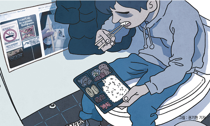 일본에선 이미 화장실이 청년들의 도피처로 자리 잡은 상태다. 2009년쯤 ‘화장실 밥’으로 일컫어지는 ‘벤조메시(便所飯)’가 이슈가 됐다. 아사히신문 석간 1면 톱기사로 보도되면서다. 도쿄대를 비롯한 몇몇 대학에 ‘변소밥’을 금지하는 벽보가 붙었는데, 대학 당국은 붙인 적이 없다고 하는 내용이었다. 지금도 일본인들의 사회관계망서비스에선 쇼핑몰 등에 ‘화장실밥’을 금지한다는 문구가 있다는 사진, 다른 사람을 피해 벤조메시를 하고 있다는 글 등을 쉽게 찾아볼 수 있다. 일본에선 ‘화장실밥’의 이유를 친구조차 없는 사람이라는 낙인이 찍힐지도 모른다는 공포나 불안감, 스트레스에서 찾고 있다.