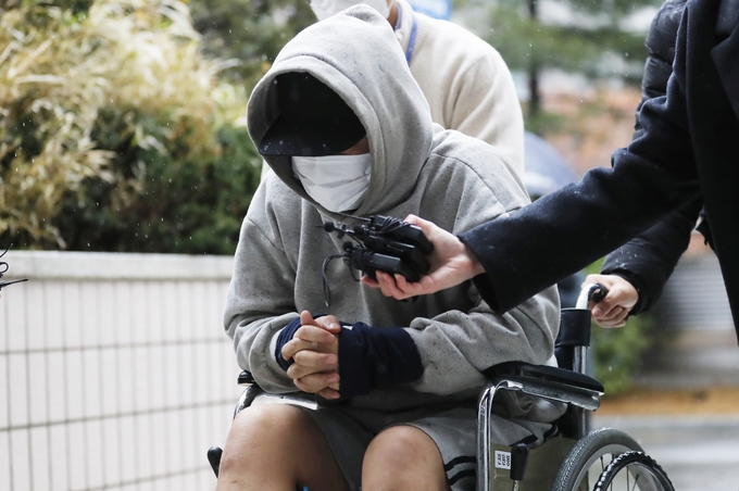 휠체어를 타고 나타난 그는 “사전 계획을 하고 범행했냐”는 취재진 질문에 아무 대답을 하지 않았다.