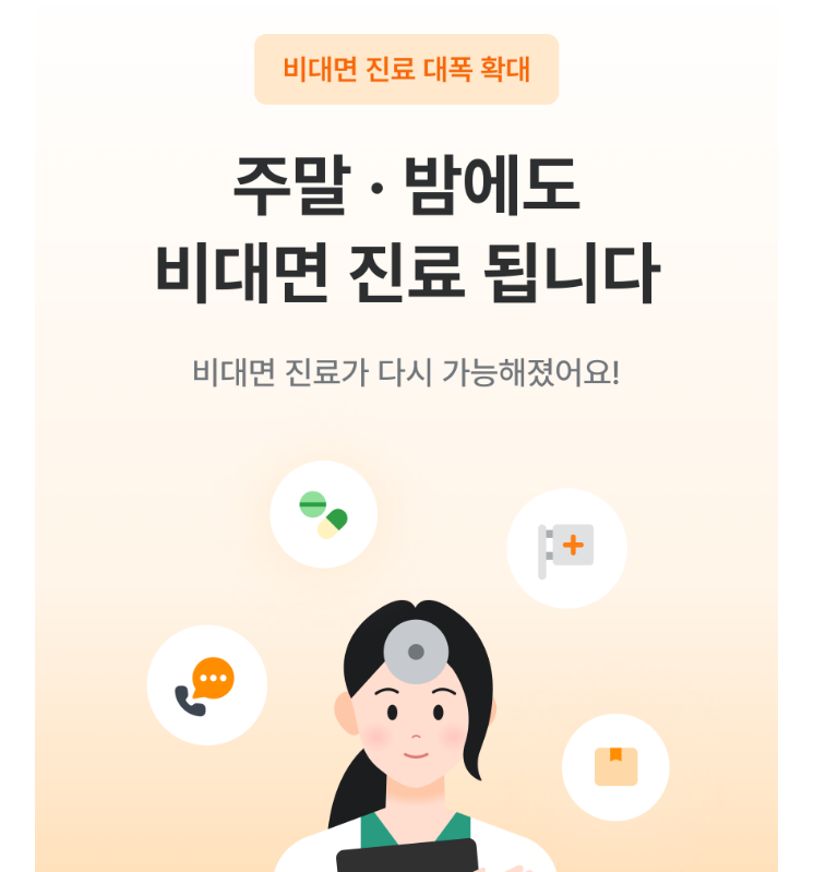 비대면 진료는 지난 15일부터 휴일·야간에 병원에 가지 않고 누구나 화상·전화 통화로 진료받을 수 있도록 확대 시행되고 있다. 개별 의료기관은 자율적으로 비대면 진료 여부를 결정할 수 있다. 대면 진료를 해야 환자의 정확한 상태를 알 수 있는 경우 의사는 비대면 진료를 거부할 수 있다. 약 배송은 전과 마찬가지로 감염병 확진자 등 일부 대상에 한해서만 허용된다.
