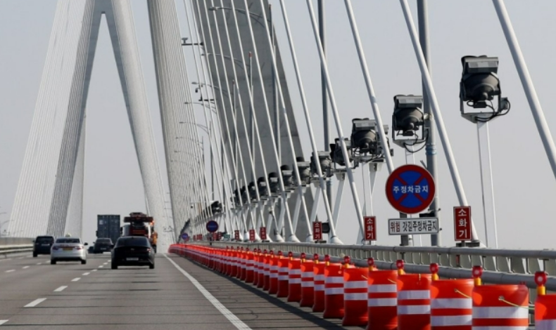 인천대교 갓길에 설치된 드럼통. 연합뉴스