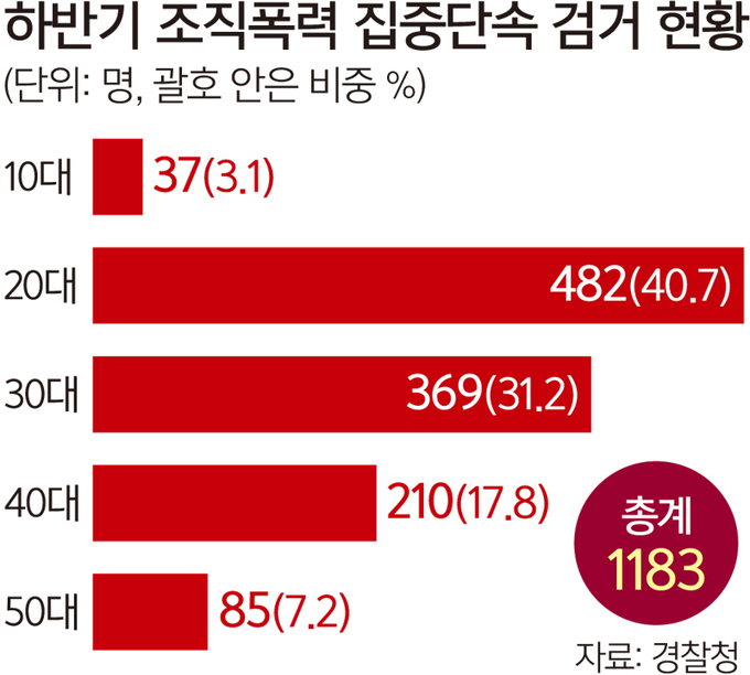 20일 경찰청에 따르면 국가수사본부가 지난 8월부터 4개월간 하반기 폭력조직 집중단속 테마를 MZ조폭으로 삼고 조사를 벌인 결과, 10대부터 30대까지가 전체 검거 인원의 4명 중 3명꼴(75.0%)을 차지했다. 총 검거 인원은 1183명, 이 중 189명이 구속됐다. 작년 같은 기간보다 검거 인원은 44.6%가 늘었고, 구속된 피의자는 19.6%나 증가했다. 범죄수익금 54억6000만원은 기소 전 몰수·추징 보전 조치했다. 이는 전년 동기(16억8000만원) 대비 3배 이상의 규모다.