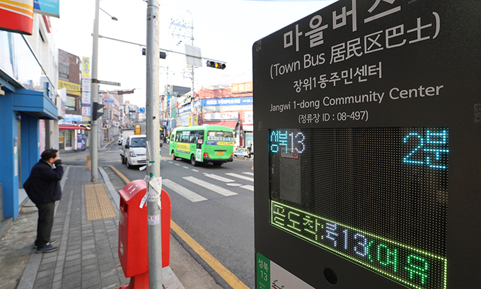 ‘마을버스 혼잡도 안내 서비스’가 시행된 26일 서울 성북구 한 마을버스 승강장에 마을버스 차내 혼잡도가 표시되고 있다. 혼잡도 안내는 버스 내부의 밀집 정도를 여유·보통·혼잡 등으로 구분해 버스 정보 안내 단말기(BIT)를 통해 실시간 알려주는 서비스다.