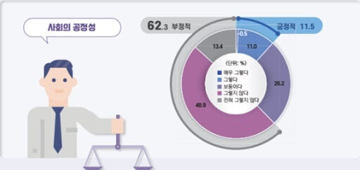 19∼69세 국민 2323명을 대상으로 시행한 조사 결과에 따르면 ‘우리 사회가 공정하다고 생각하는가’라는 질문에 대해 11.5%(‘매우 그렇다’ 0.5%, ‘그렇다’ 11.0%)만 긍정적으로 답했다.