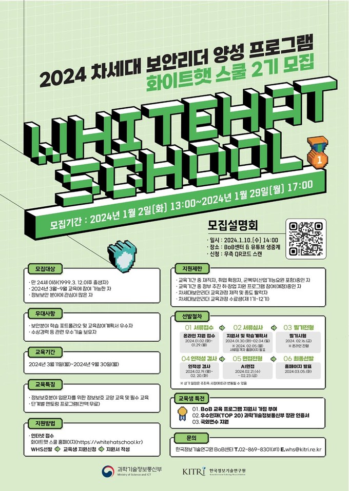 과학기술정보통신부(장관 이종호)가 주최하고 한국정보기술연구원(원장 유준상)이 주관하는 차세대 보안리더 양성 프로그램 “화이트햇 스쿨”(White Hat School, 이하 화이트햇 스쿨) 제2기 교육생을 오는 1월 29일까지 모집한다.