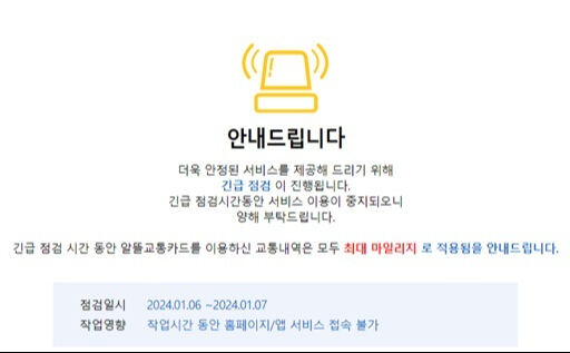 6일 국토교통부에 따르면 알뜰교통카드 모바일 애플리케이션과 홈페이지가 이날 오전 11시께부터 긴급 점검에 따라 서비스를 중단했다. 점검 기간은 오는 7일까지다.