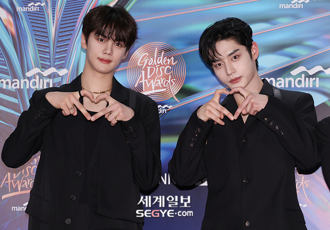 그룹 제로베이스원 김규빈(사진 왼쪽)과 김지웅이 6일(현지시간) 인도네시아 자카르타 인터내셔널 스타디움에서 열린 '38회 골든디스크 어워즈 with 만디리' 레드카펫 행사에서 포즈를 취하고 있다.