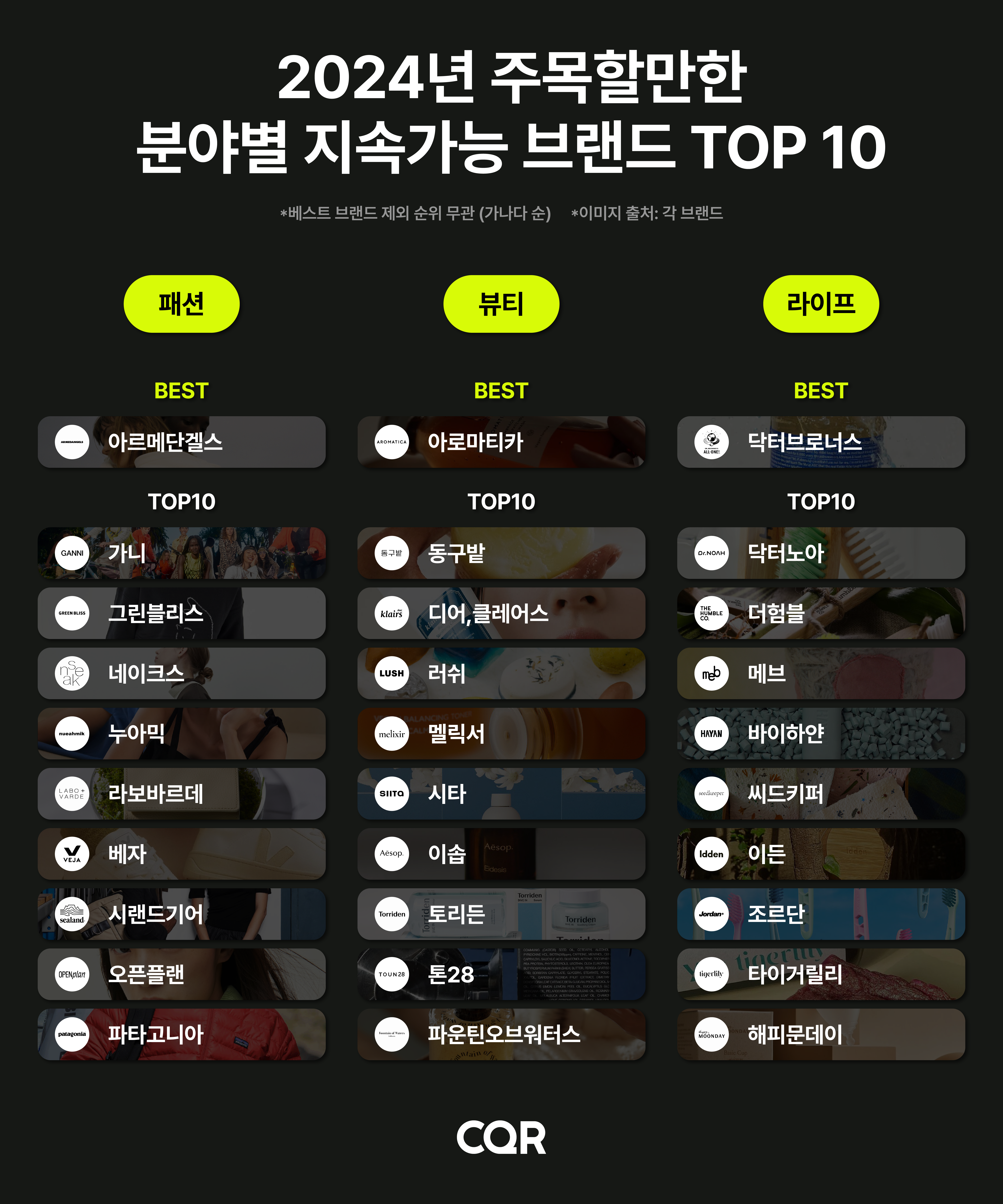 지속가능 라이프스타일 커뮤니티 ‘CQR’이 올해 주목할 패션/뷰티/라이프 분야별 지속가능 브랜드 Top 10을 선정해 발표했다.