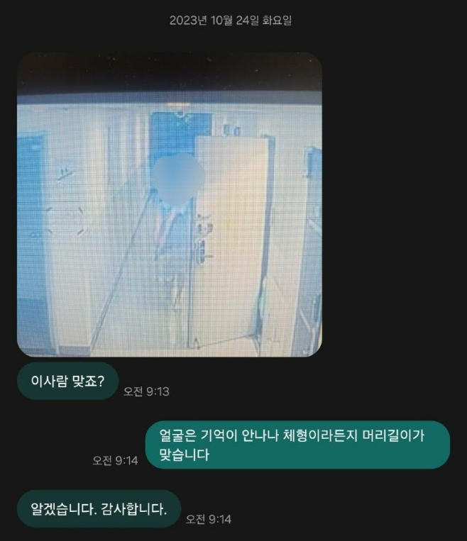 11일 오전 3시 40분 절도 피의자 옆집 여성은 “512호입니다. 생수 금액과 예금주명, 은행, 계좌번호 보내주세요. 번거롭게 해서 죄송합니다. 적은 금액이지만 이틀내 입금드리겠습니다”라고 A씨에 메시지를 보냈다.