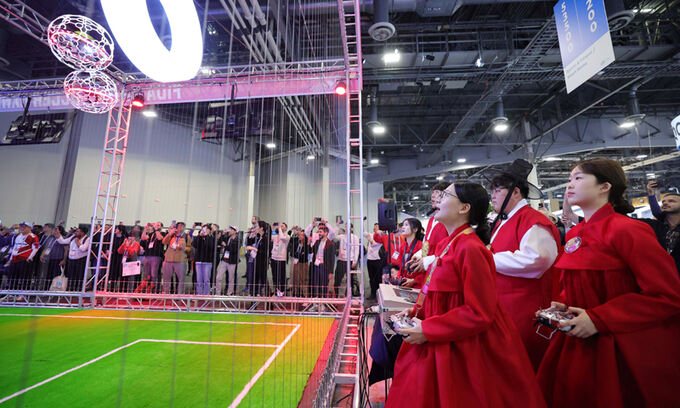 공중에 매달린 두 개의 흰 도넛 모양 고리를 골대삼아 푸른빛과 붉은빛을 내는 드론볼 각 5대가 편대비행하며 겨루는 박진감 넘치는 장면에 각국에서 모여든 관람객과 취재진이 매료된 결과다. 골대 주위를 지키는 수비진을 따돌리고 스트라이커 역할을 하는 드론볼이 고리를 통과하는 순간, 흰 고리는 붉은 색으로 발광하고 지켜보던 관중은 환호성을 질렀다. 경기가 진행될 때마다 발생하는 굉음과 현장 열기에 CES 관람객들은 드론축구 부스로 몰려들어 응원하고, 환호하고, 격려했다.