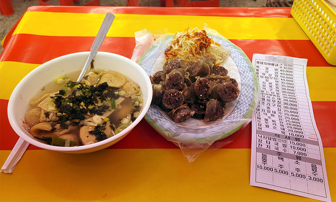 식사를 마치고 계산을 하면서 취재 중이라는 사실을 밝혔다. 그러자 상인은 기존 가격표를 달라고 하더니 어디선가 새로운 가격표를 꺼내 보여줬다. 순대는 5000원 내려간 1만5000원이었다. 오징어순대 등 일부 메뉴 가격도 5000원에서 최대 만원까지 조정돼 있었다. 2만5000원을 결제했다. 상인은 “착오가 있었다”고 해명했다. 새 가격표를 줘야 했으나 실수로 이전 가격표를 줬다는 말을 덧붙였다. 하지만 다른 테이블을 확인해보니 기존 가격표가 놓여 있었다.