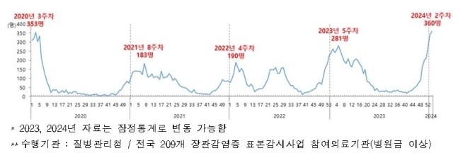 올해 2주차(1월 7∼13일)에만 360명이 노로바이러스에 감염됐는데, 이는 최근 5년 중 주간 단위로 가장 많은 감염자가 나온 2020년 3주차(353명)보다 많은 수치다.