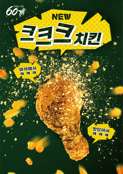 ‘크크크치킨’은 60계치킨의 인기메뉴로 크럼블을 입혀 크런치하고 크리스피한 치킨으로 치킨 본연의 매력인 바삭함을 강조해 60계치킨의 브랜드 가치인 깨끗한 기름의 깔끔함을 느낄 수 있다.