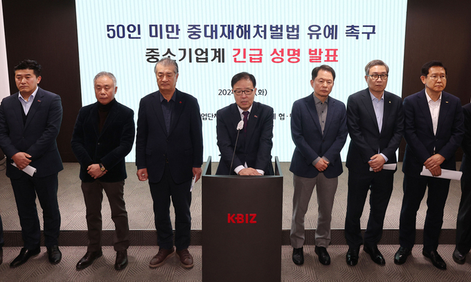 중소기업중앙회 등 경제 6단체가 어제 국회에서 기자회견을 갖고 “83만이 넘는 50인 미만 소규모 사업장들의 절박한 호소에 귀를 기울여 달라”며 “중대재해법 적용 유예법을 하루빨리 처리해달라”고 밝혔다. 2022년 1월 시행된 중대재해처벌법은 사망 등 중대재해 시 사업주 등을 1년 이상 징역 또는 10억원 이하 벌금에 처하도록 하고 있다. 다만 50인 미만 사업장은 법 시행이 2년 유예돼 오는 27일부터 적용된다. 하지만 중소·영세업체들은 안전관리체계 미비 등을 들어 추가 유예가 필요하다고 한다.
