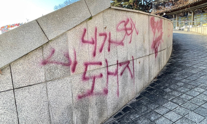 서울 송파경찰서는 25일 올림픽공원에 낙서한 혐의를 받는 초등학생 2명을 검거했다. 경찰은 이날 오전 9시쯤 “올림픽공원 수변무대가 낙서로 훼손됐다”는 112 신고를 접수하고 수사에 나섰다. 낙서로 훼손된 곳은 올림픽공원 수변무대의 계단식 좌석과 뒤편 타일 벽면이다. 빨간색 스프레이로 ‘돼지’ 등 한글과 글자를 알아보기 어려운 알파벳이 섞인 낙서 10여개가 발견됐다.