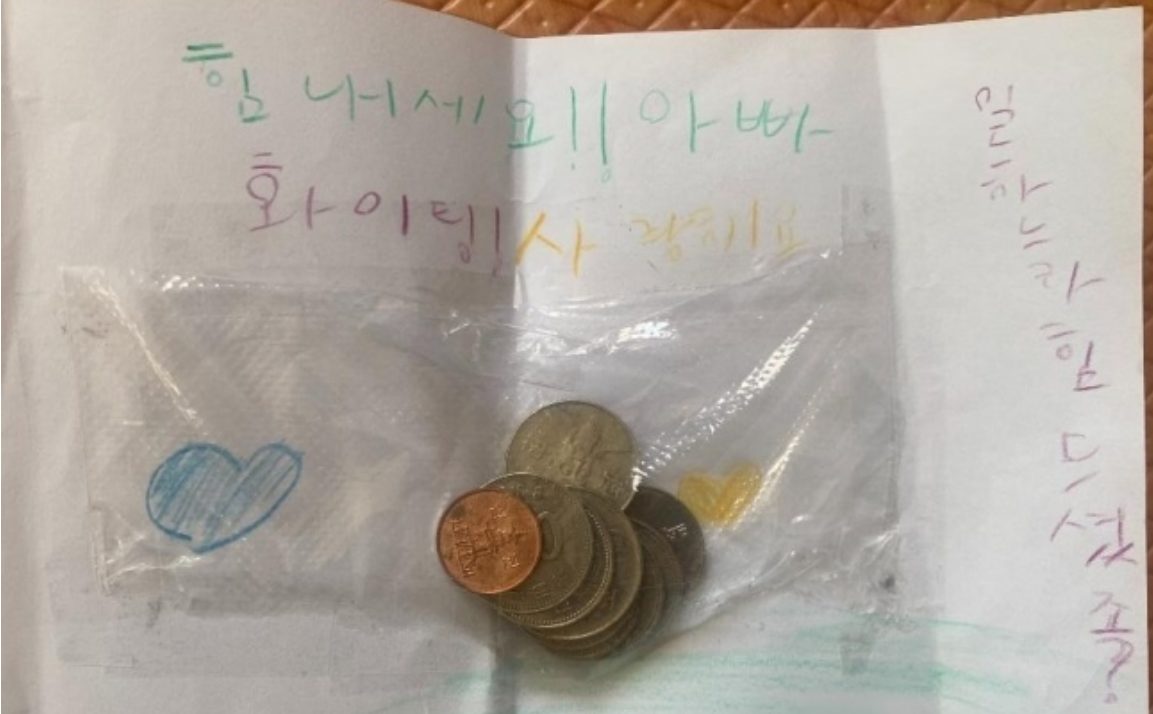 사진에는 A씨의 막내딸이 전한 편지가 담겨있었는데, 딸은 "일하느라 힘드셨죠? 힘내세요. 아빠 화이팅! 사랑해요. OO이가"라는 메시지를 남겼다. 또 편지에 붙은 비닐 안에는 100원짜리와 10원짜리 등 동전 10개가 들어있었다.