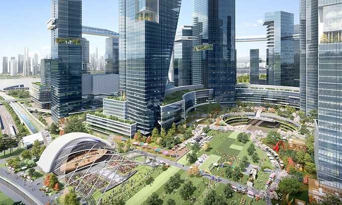 100층 안팎의 랜드마크가 중심부에 우뚝 세워지고 주변으로 세계 최초 45층짜리 건물을 잇는 1.1㎞ 스카이트레일이 설치되는 용산국제업무지구 그린스퀘어 조감도.
