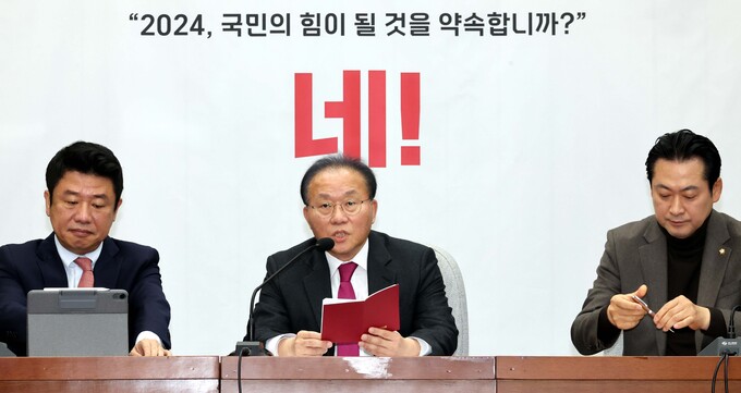 윤재옥 국민의힘 원내대표가 6일 국회에서 열린 원내대책회의에서 발언을 하고 있다.