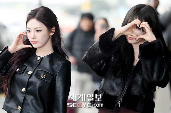 그룹 에스파 닝닝(사진 왼쪽)과 지젤이 SM타운 도쿄 콘서트 일정을 위해 20일 오전 김포국제공항을 통해 일본 도쿄로 출국 전 포즈를 취하고 있다.