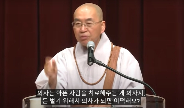 스님은 “돈 벌기 위해 의사가 되니까 없는 병도 있다고 하고, 작은 병도 큰 병이라 하고, 수술 안 해도 되는 걸 해야 된다 하고, 이래서 과잉진료가 되고 문제가 되는 것”이라며 “지금 공부 제일 잘하는 순서대로 성형외과로 지원한다는데 이게 무슨 의사예요? 미용사지”라고 일침을 가했다. 이어 “이렇게 모두 돈에 미쳐서 세상이 잘못 돌아가니까 혼란스러운 것”이라고도 한탄했다.