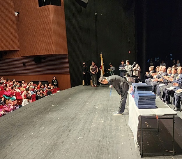 정청래 더불어민주당 최고위원은 27일 만학도들의 졸업식을 찾아 “대한민국 국회의원으로서 여러분이 자랑스럽고, 감사하다”며 넙죽 큰절을 올렸다.