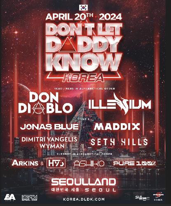 유명 해외 DJ와 음악 프로듀서가 출연하는 일렉트로닉 댄스 뮤직(EDM) 축제 ‘돈트 렛 대디 노우’(Don’t Let Daddy Know·DLDK코리아·포스터)가 4월20일 과천 서울랜드에서 열린다고 공연 기획사 비이피씨탄젠트가 28일 밝혔다.