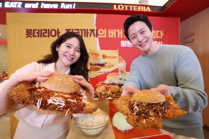 29일 서울 중구 롯데리아 동대문역사문화공원역점에서 남녀 모델들이 롯데리아가 출시한 신제품 '왕돈까스버거' 2종을 소개하고 있다. 왕돈까스버거는 남녀노소 모두가 선호하는 왕돈까스패티와 양배추, 경양식 돈까스 소스를 접목하여 풍성한 맛과 불륨감이 특징이다.