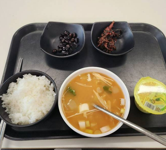 사진 속에는 밥 한 공기와 콩자반, 국과 김치 등의 반찬 세 가지 그리고 오렌지 주스 하나가 담긴 식판이 보인다. A씨는 “국에 들어간 버섯은 식감이 아삭해서 하나도 안 익은 것 같았다”며 “어떻게 학교 식당에 고기는커녕 두부조차 없을 수 있느냐”고 말했다.