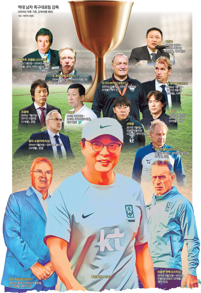 대표팀 감독 자리가 임기를 채우지 못하고 예기치 않은 공석이 된 건 낯설지 않다. 2002년 한일월드컵 거스 히딩크 감독부터 클린스만 감독까지 사령탑 13명의 평균 재임 기간은 ‘19개월’에 불과했다. 새로운 바람을 불러일으키기 위해 선임한 외국인 감독뿐 아니라 소방수 역할로 투입된 국내파 감독도 마찬가지였다.