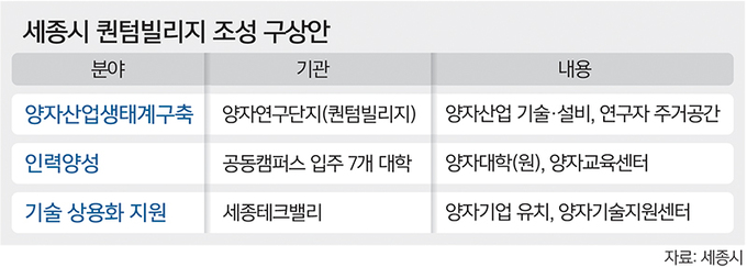 시는 공동캠퍼스에서 양자 인력 전문 인력을 양성하고 세종테크밸리 양자기업엔 양자기술상용화를 지원한다는 구상이다. 퀀텀빌리지에는 양자 연구 시설과 장비, 연구자들의 거주공간이 마련된다.