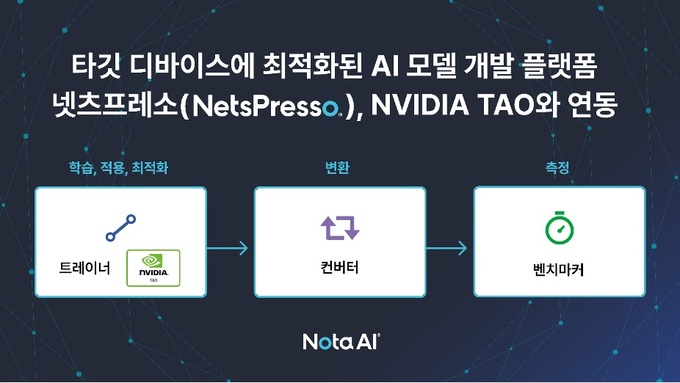 노타는 엔비디아와 지속적인 협업을 구축해왔다. 특히 노타가 개발한 ‘넷츠프레소’는 엔비디아의 공식 성공 사례에 선정된 바 있다. ‘넷츠프레소’는 타겟 하드웨어에 최적화해 AI 모델을 경량화·개발할 수 있는 플랫폼이다.