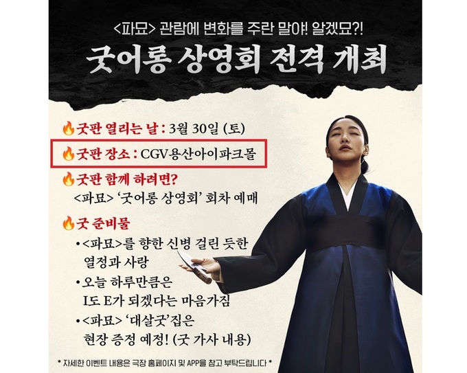 흥행 가도를 내달리며 전국 900만 관객 동원을 눈앞에 둔 영화 ‘파묘’ 속 ‘혼(魂) 부르기’와 ‘대살굿’ 장면을 따라하는 이른바 ‘굿어롱 상영회’가 오는 30일 CGV 용산아이파크몰에서 열린다.
