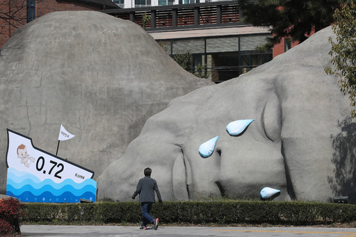 한 시민이 18일 대구 달서구 선사유적공원 진입로 인근에 설치된 조형물 ‘이만옹’(二萬翁)을 바라보고 있다. 최근 주민 공모를 통해 명명한 이만옹(이만년의 역사를 간직한 거대 원시인)을 홍보대사로 위촉한 달서구는 지난해 역대 최저 합계출산율(0.72명) 등 소멸하는 대한민국에 눈물을 흘리는 이만옹의 모습을 통해 인구절벽 문제의 심각성에 대한 공론화에 적극 나서고 있다.