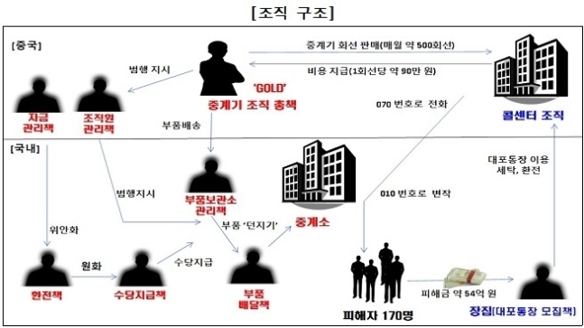 중국·태국·남아공·아이티 출신의 국내 조직원들은 중계기 관리책, 환전책, 수당지급책 등으로 철저히 역할을 분담해 범행한 것으로 나타났다. 이들은 가담 기간에 따라서 중요한 업무를 배당받았고, 업무 내용에 따라서 매주 50~100만원의 수당을 지급받았다고 한다.