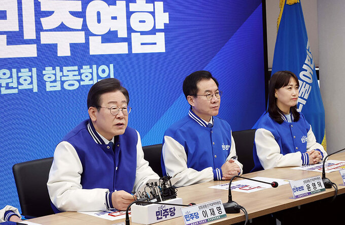 이재명 더불어민주당 대표가 20일 서울 영등포구 더불어민주당 중앙당사에서 열린 더불어민주당·더불어민주연합 중앙선거대책위원회 합동회의에서 발언하고 있다. 서상배 선임기자