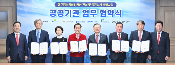 20일 대구시에 따르면 이날 시청 산격청사에서 한국토지주택공사, 한국공항공사, 대구도시개발공사, 대구교통공사, 경북도개발공사 등과 신공항 건설과 종전부지 개발사업을 주된 내용으로 한 업무협약을 했다.