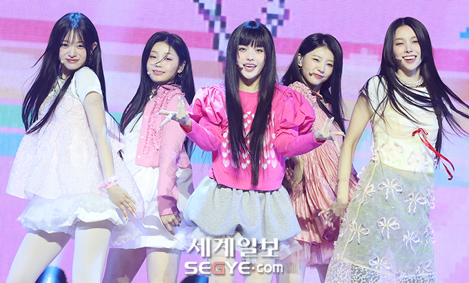 하이브(HYBE) 새 걸그룹 아일릿(ILLIT)이 25일 오후 서울 용산구 한남동 블루스퀘어에서 열린 미니 1집 '슈퍼 리얼 미(SUPER REAL ME)'의 쇼케이스에 참석해 열띤 공연을 펼치고 있다.