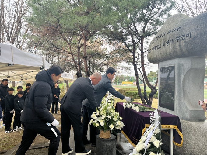 천안시티FC 단장·감독·선수 등이 26일 천안초등학교 축구부 합숙소 화재 사고 21주기 추모식에 참석해 희생자들을 추모했다.
