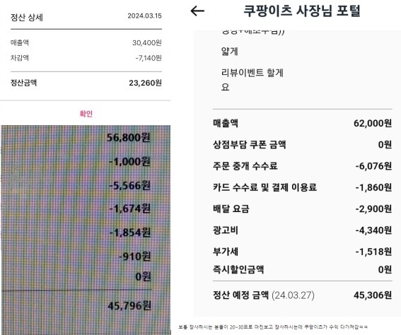 D씨는 “얼마 전 쿠팡이츠 영업사원 2명이 가게로 찾아왔는데 단호하게 돌려보냈다”며 “2만1000원 짜리 팔고 1만5000원 입금되는데 당신들 같으면 하겠냐고. 안하니까 나가세요라고 했다”고 말했다.