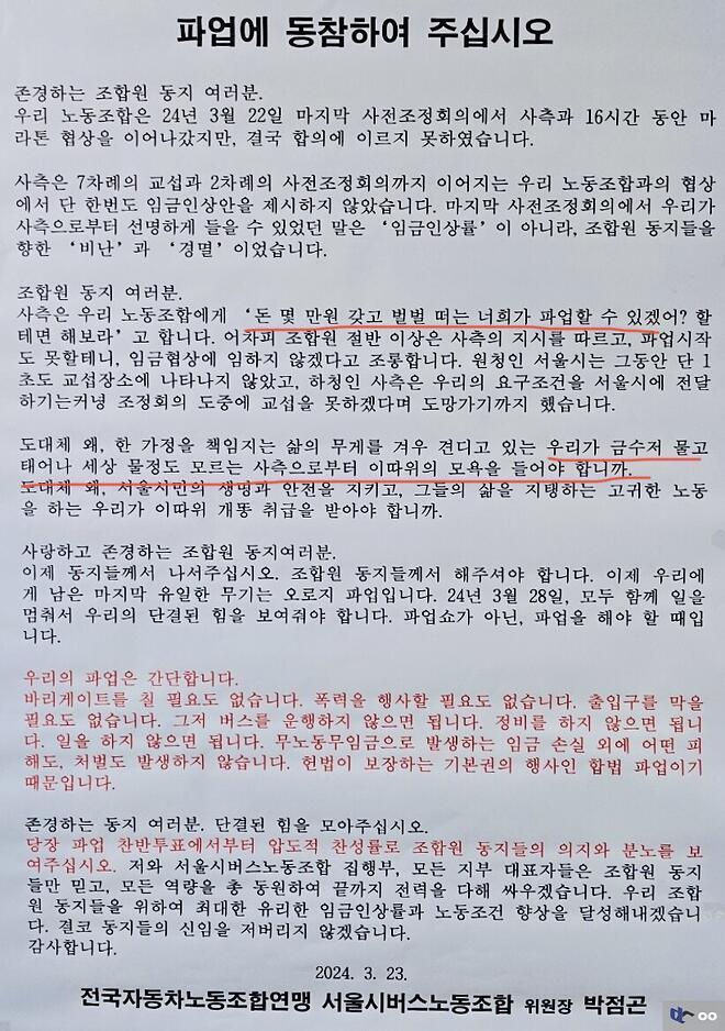 서울시 버스노조가 파업 동참을 호소한 글에는 ‘사측은 우리 노동조합에게 돈 몇만 원 갖고 벌벌 떠는 너희가 파업할 수 있겠어? (파업을) 할 테면 해보라’라는 내용이 담겼다.