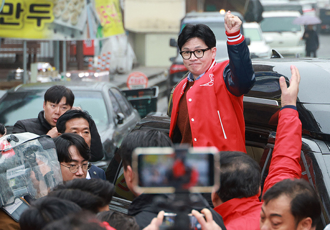 국민의힘 한동훈 비상대책위원장 겸 총괄 선거대책위원장이 29일 경기 의왕 부곡시장 인근에서 지지자들에게 인사하고 있다.의왕=연합뉴스
