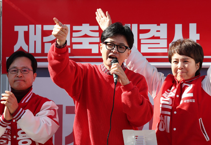 한동훈 국민의힘 비상대책위원장이 31일 오전 경기 성남시 분당구 오리역광장에서 열린 '국민의힘으로 성남살리기' 지원유세에서 윤용근 중원구, 김은혜 분당구을, 장영하 수정구 후보의 지지를 호소하고 있다. 사진 = 뉴시스