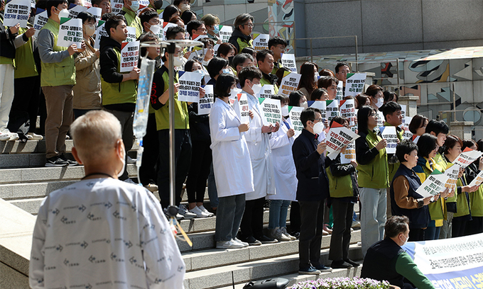 1일 서울 서대문구 세브란스병원에서 ‘서울지역 전공의 수련병원 현장 노동조합 대표자 합동 기자회견’이 열린 가운데 한 환자가 이 모습을 지켜보고 있다. 노조원들은 “수백 명의 보건의료노동자가 무급휴가로 내몰리며 일방적인 임금 삭감을 강요받고 있다”며 전공의 즉각 복귀, 환자와 병원 노동자가 참여하는 사회적 대화 등을 촉구했다.