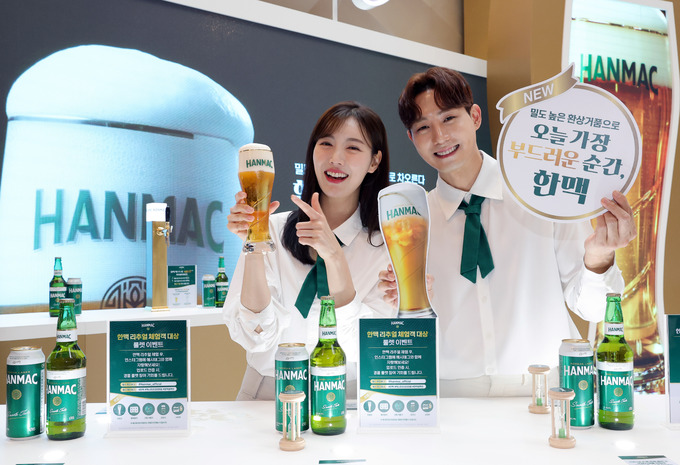 3일 서울 여의도 IFC몰에서 모델들이 스페셜 마이크로 크림 탭을 적용한 오비맥주의 신제품 '한맥 엑스트라 크리미 生'을 선보이고 있다.