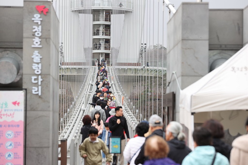 한국의 아름다운 길 100선 중 한 곳인 전북 임실군 옥정호 드라이브길 일대에 벚꽃이 만개한 가운데 관광객들이 10일 옥정호 출렁다리를 건너며 주변 풍광을 감상하고 있다. 옥정호는 1928년 섬진강 상류에 건립된 댐으로 생긴 저수량 4억6000만t의 인공호수이며, 출렁다리는 옥정호 중간 붕어섬을 잇는 길이 420m, 폭 1.5m 규모의 다리로 2022년 10월 개통했다.